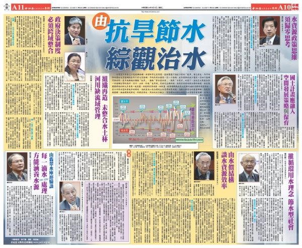 余紀忠文教基金會一本看顧台灣的海洋、河川、山林,珍視「自然財」是世代生機所賴,面對資源困境與永續的維護,與長期關懷環境的邱文彥委員一起策劃,共邀專家李鴻源、田秋堇、歐陽嶠暉與政府決策官員葉欣誠深度對話,在今日節水型社會起步的時刻,為政策決心及治理的上位思考凝聚共識,為執行與整合的重重障礙,做監督與提醒。無論開源或節流,終將在保水、用水的水分配上、需整體性的國土規劃及水資源管理架構。必須以國土承載力及水涵養的可持續性為前提,具體思維與相關立法、修法、有效執行必須結合民眾,立即行動。