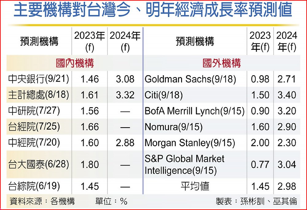 央行對今年台灣經濟成長率的預估,從去年12月的2.53%,今年3月下修至2.21%,6月下調至1.72%,9月是第三度下修至1.46%。