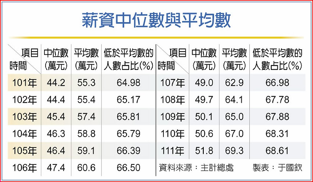 主計總處30日公布111年「薪資中位數及分布統計」,由於極端高薪族群薪資快速成長,推升平均薪資,以致領不到平均薪資的上班族人數占比升至68.61%,再創新高,顯示中產階層與極端高薪族群的薪資差距,續呈擴大。