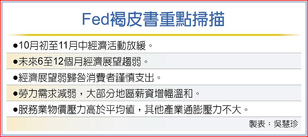 美國聯準會(Fed)29日公布俗稱《褐皮書》的地區經濟調查報告,顯示10月初至11月中旬美國經濟活動放緩。企業回報通膨壓力大幅舒緩且聘雇難度減輕,但因消費者支出謹慎,未來半年到一年的經濟展望趨弱。