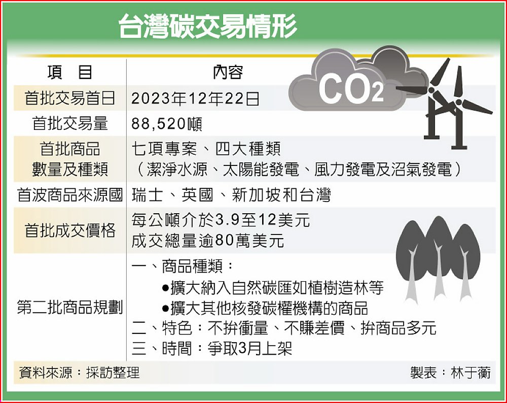 去年12月22日啟動首批碳交易,引爆45家企業搶購,並創下8.8萬噸的交易量。據了解,首波7檔商品預計賣到農曆年後,碳交所3月將再推第二批商品上架。為滿足國內企業多元需求,下一波可望納入自然碳匯的碳權商品,而非只有再生能源、生質能源類別。