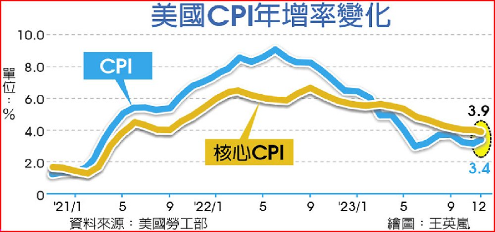 美國勞工統計局公布去年12月消費者物價指數(CPI),結果較去年同期增加3.4%,不僅出現回升、且創3個月最大漲幅。此外,反映潛在物價壓力的核心CPI年增3.9%,雖較11月放緩0.1個百分點,但仍高出市場預期的3.8%。鑒於美國通膨在去年底再加速,導致市場對於聯準會(Fed)將在3月降息的預期已遭到嚴重挑戰。