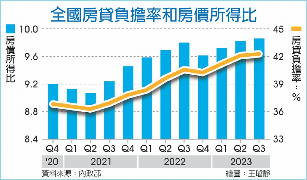 內政部15日發布2023年第3季全國房價所得比為9.86倍,寫下歷史新高紀錄,相當於民眾要不吃不喝將近十年才能買得起房子。另外,全國房貸負擔率為42.25%,也同樣續創歷史新高,房價負擔能力維持在「偏低」等級。