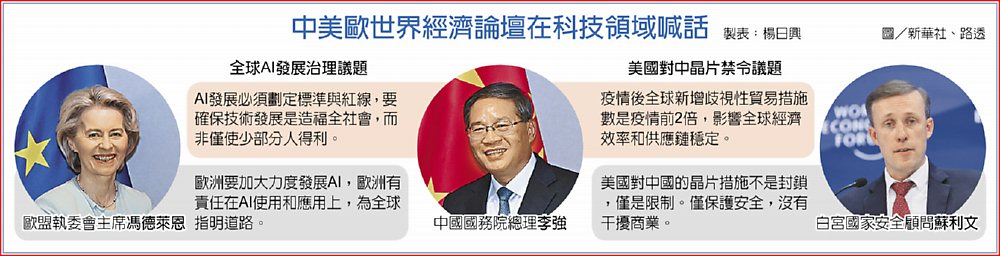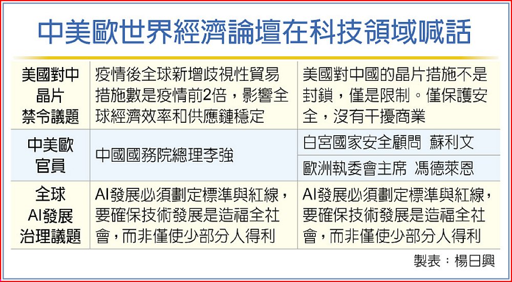 過去一年全球颳起人工智慧(AI)旋風,中美歐等主要經濟體在今年初世界經濟論壇上隔空交鋒科技議題。中美就晶片禁令叫陣,中方批評美國歧視性措施干擾全球經濟。美方則回應,對中國的措施僅是「限制」,而非「封鎖」。