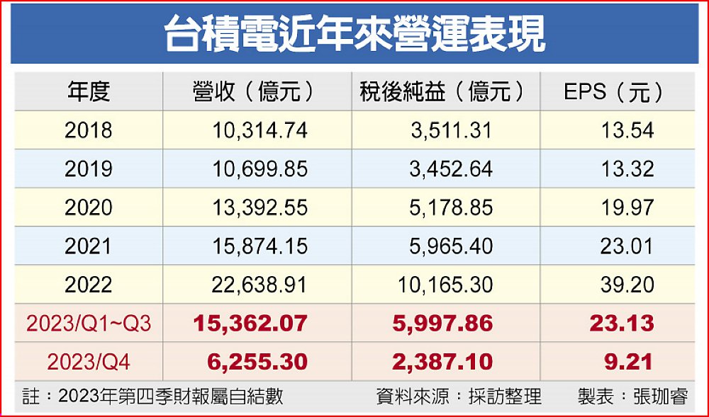 台積電18日舉行法說會,2023年第四季每股稅後純益(EPS)9.21元優於市場預期,全年EPS 32.34元,創史上次高。總裁魏哲家表示,台積電製程仍居領先地位,受惠於AI、HPC需求帶動,2024年資本支出預估約280~320億美元,全年營收有望繳出年增21~25%的成績單。