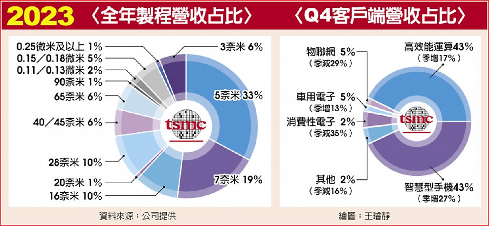 台積電去年第四季的營收約6,255億元,稅後純益為2,387億元,毛利率為53%,EPS 9.21元,創去年單季新高。台積電先進製程第四季銷售金額達67%,其中,三奈米占15%,較第三季翻倍成長,五奈米占35%、七奈米占17%,已正式擺脫成熟製程價格波動影響。
