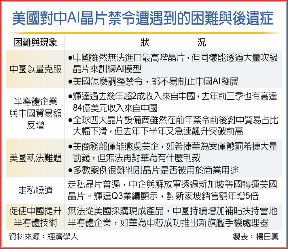 如何面對美企仍是白宮最頭痛難題,嚴格封鎖會衝擊美企與盟國利益,有限管控又無法真正阻擋中國。從美國商務部長雷蒙多去年嚴厲警告企業勿設計新晶片繞道供應中國,不久後又對輝達改良產品開綠燈,就能看出其中矛盾。