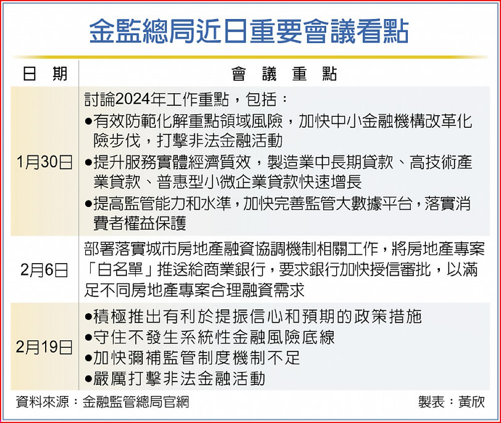 金監總局官網公布的新聞稿指出,李雲澤19日在會議上表示,要貫徹前一天國務院會議的精神,要把握形勢,積極推出有利於提振信心和預期的政策措施,確保全年度工作良好開局、高標起步。