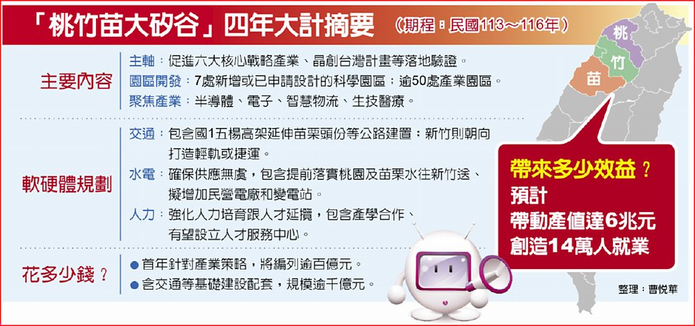 行政院會今(22)日將拍板「桃竹苗大矽谷計畫」。據了解,方案為4年期,從今年開始推動。內容聚焦半導體、電子、智慧物流、生醫等核心戰略產業,首年投入資金破百億元,加上交通等基礎建設,規模逾千億元,預計帶動6兆元產值、創造14萬人就業。