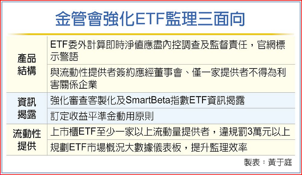 金管會強化ETF監理,投信業者表示,很多措施都已落實,但在現行資金加速湧入ETF投資時,金管會要強化基金「折溢價過大」的監理,應有配套措施、拉高募集額度或給予合理區間,否則業者擔心恐「無辜」受罰。