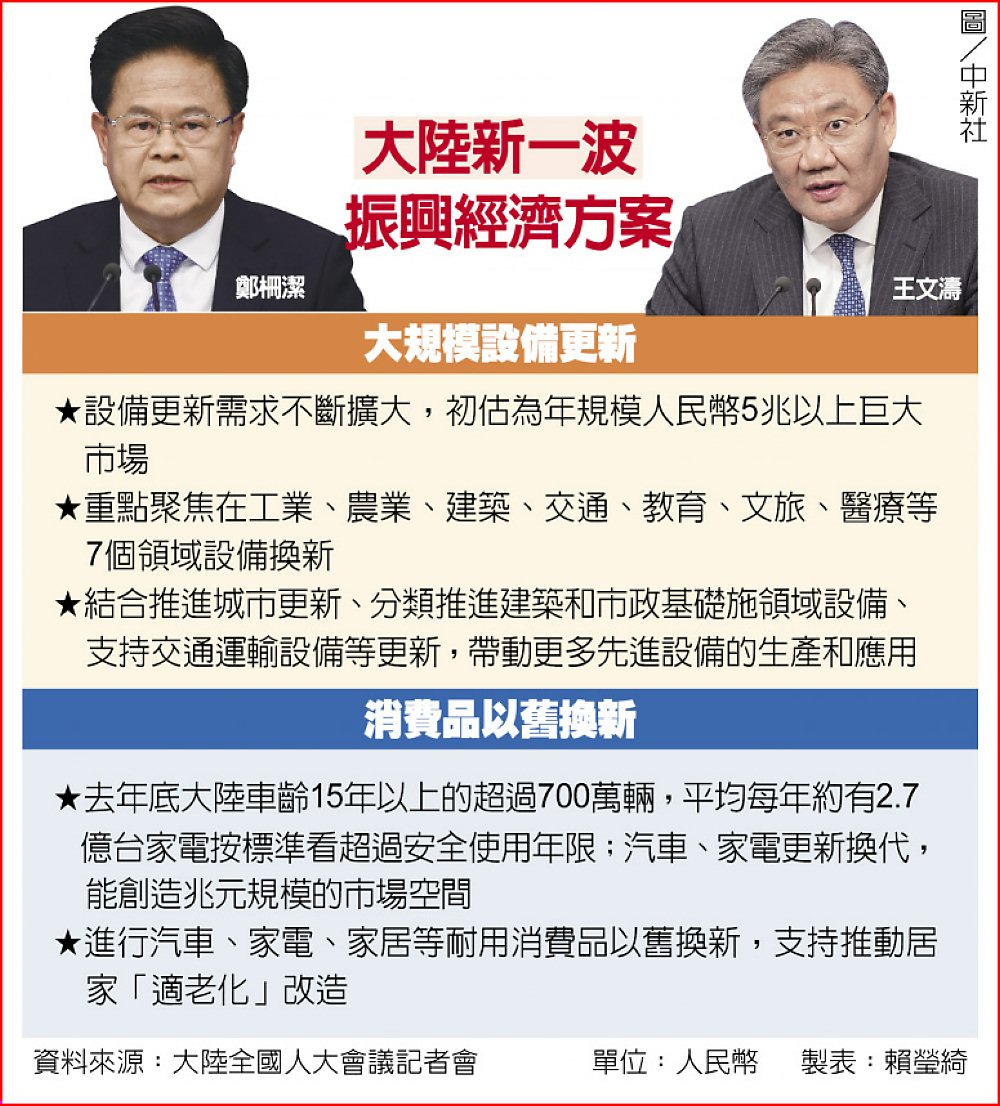 大陸將祭出擴大設備更新和消費品以舊換新兩大策略,為現階段提振經濟成長收強刺激之效。這項政策聚焦在工業、交通等7領域,初估每年市場規模達人民幣(下同)5兆元,並將同步推動汽車與家電以舊換新,預計創造1兆元規模的市場空間。