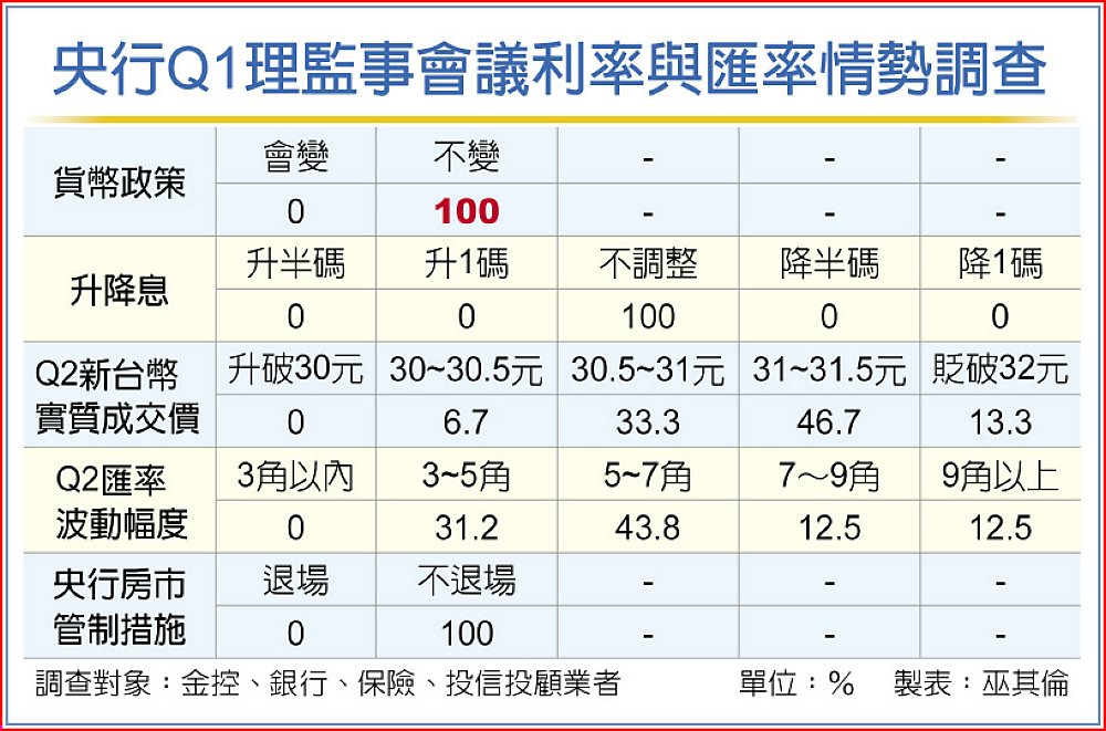本報調查結果顯示,金融業全數認為央行政策利率不變,貨幣政策基調不會轉寬鬆,市場環境持續溫和緊縮。