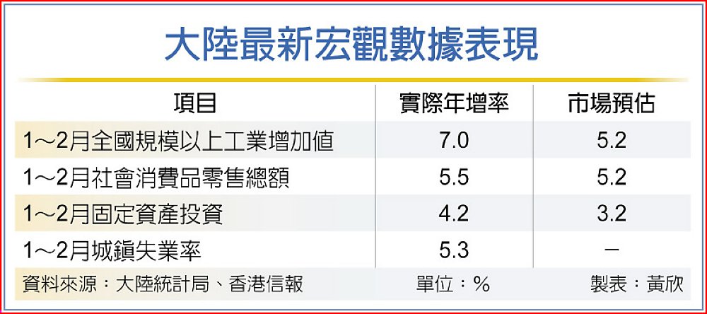 界面新聞報導,光大銀行金融市場部宏觀研究員周茂華分析,1~2月工業、消費、投資數據均優於預期,反映國內宏觀政策效果持續釋放,這也預示著第一季經濟增長實現「開門紅」的機率大增。