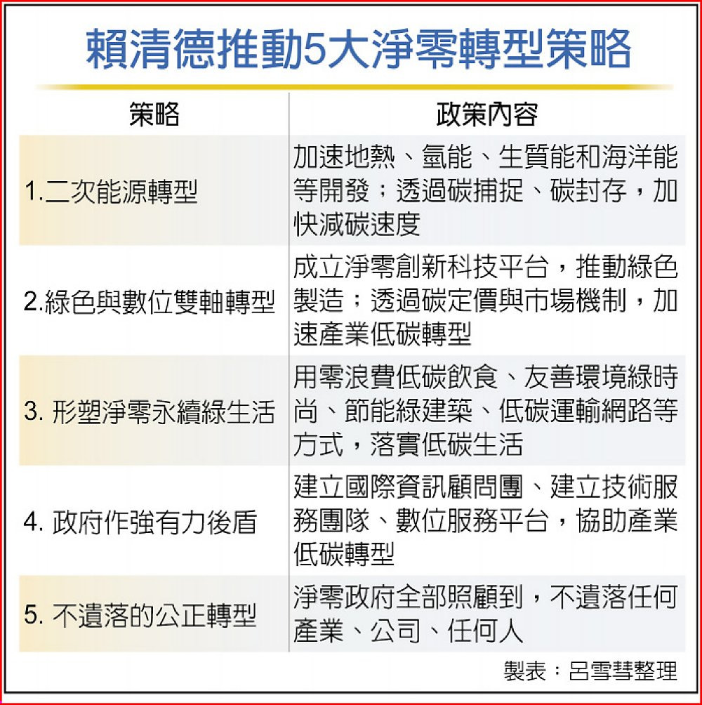 準總統賴清德22日在世界地球日宣告,上任後將提出啟動第二次能源轉型在內的五大策略,推動淨零轉型,並點名ICT及金融兩大產業應配合協助,讓台灣面對氣候變遷挑戰彎道超車,成為國際新典範。國發會主委龔明鑫也說明能源轉型目標,他表示,「若2030年再生能源容量達到三倍,現在許多能源爭議都將淡化,屆時再生能源會真正成為台灣發電的主力。」