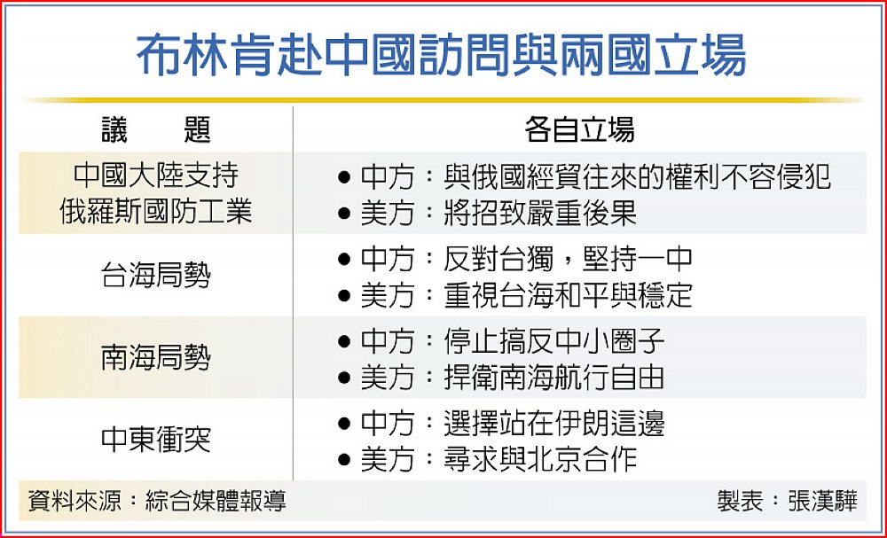 美國之音報導,布林肯此行將聚焦中國支持俄羅斯國防工業、台海局勢、南海局勢、中東衝突等議題,其中,遏止中國協助莫斯科當局重建軍工體系是首要議題,以利美國為援助烏克蘭爭取時間。