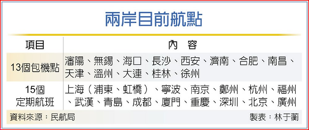 兩岸目前有15個定期點和13個包機點,自陸委會去年3月公布「恢復兩岸空運客運航點規劃」,對有需求但無條件恢復定期航班的航點得申請包機,航空公司可於獲配航權額度內,依程序申請飛航13個航點客運包機,包括瀋陽、無錫、海口、長沙、西安、濟南、合肥、南昌、天津、溫州、大連、桂林、徐州等;至於15個兩岸定期客運航點,業者則可視市場需求適時放大機型或在其獲配航權班次容量下增加載客航班。