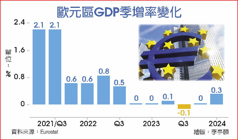 自2022年底以來,歐元區經濟停滯甚至跌入衰退,去年第三季與第四季連二季萎縮、符合「技術性衰退」定義,原因是俄烏戰爭導致食品與能源價格狂飆,同時衝擊企業與家庭信心。