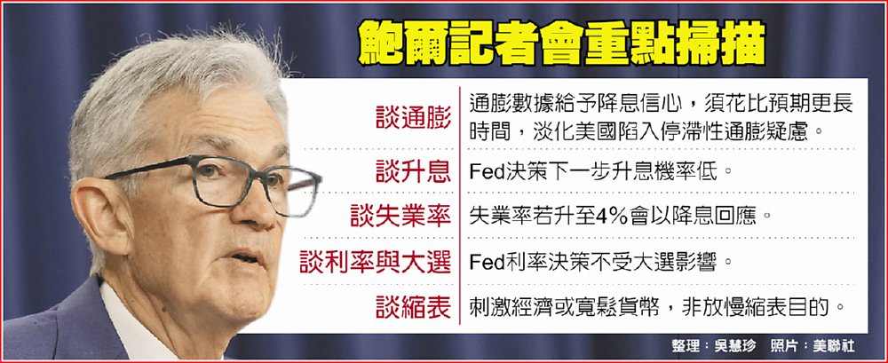 聯準會(Fed)主席鮑爾1日在會後記者會上釋鴿調,稱儘管抗通膨缺乏進展,但升息的機率不大,並淡化美國陷入停滯性通膨的疑慮,強調Fed決策的獨立性,不受總統大選的政治干擾。