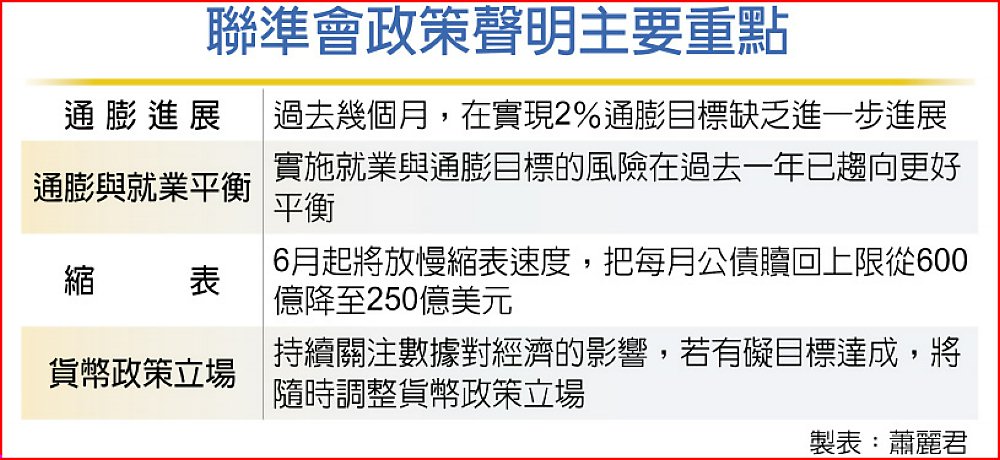 相對過去數次會議,這次聲明最大變動反應在縮減資產負債表的進程計畫。Fed宣布從6月起放慢縮表速度,將每月公債贖回上限從600億美元降至250億美元。機構債券和機構抵押擔保證券的每月贖回上限,則維持350億美元不變。