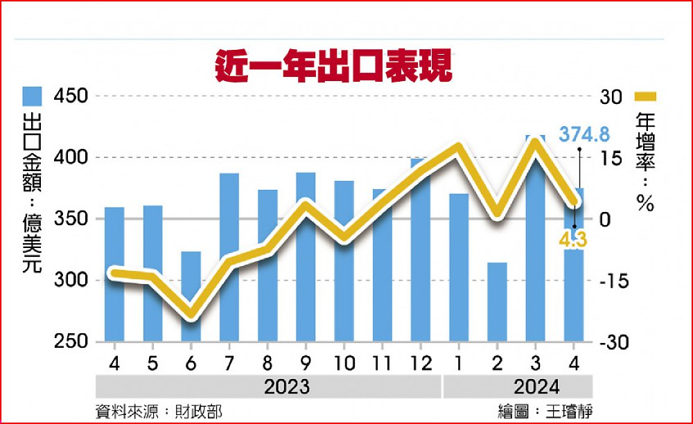資通視聽產品獨好,4月出口訂單「綠肥紅瘦」。財政部公布4月出口貿易統計,金額為374.8億美元,年增率4.3%,雖低於原預期值,仍創下歷年同月次高的紀錄,累計前4個月出口1478.1億美元,年增率10.6%。