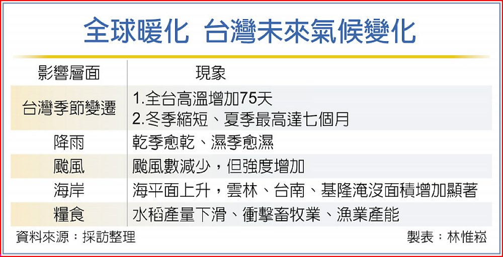 至於季節變化上,若暖化趨勢不做出改變,2040年後夏、冬季節將不再明顯,到了21世紀末,台灣夏季天數將達七個月,幾乎無冬季的存在,全年維持溫暖至炎熱的狀況,高溫超過36°C的天數將增加75天。