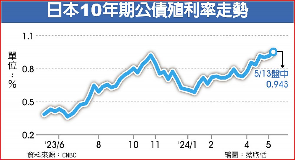 日本銀行(央行)5月13日公佈了例行的國債買入操作(公開市場操作)。剩餘期限為「5年以上10年以下」的預定買入額為4,250億日元,比上次4月24日(4,750億日元)減少了500億日元。這是自3月取消抑制長期利率的長短期利率操作(收益率曲線控制、YCC)後首次減少買進金額。受此影響,作為日本長期利率指標的新發行10年期國債殖利率一度升至0.940%,創出自2023年11月的約6個月以來的最高水準。