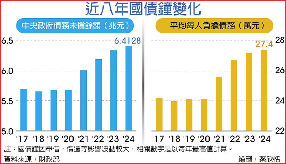 根據財政部最新數據,包括政府長期債務(1年期以上)餘額5.9938兆元、短債4,191億元、整體未償債餘額6.4128兆元、與平均每人負擔債務27.4萬元,四項數字全都創下歷史紀錄。且相較去年同期,政府總債務增加約700億元。