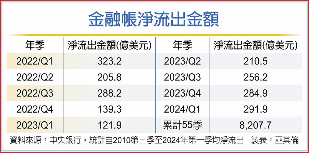 央行公布 金融帳連55季淨流出 準備資產減少3.3億美元