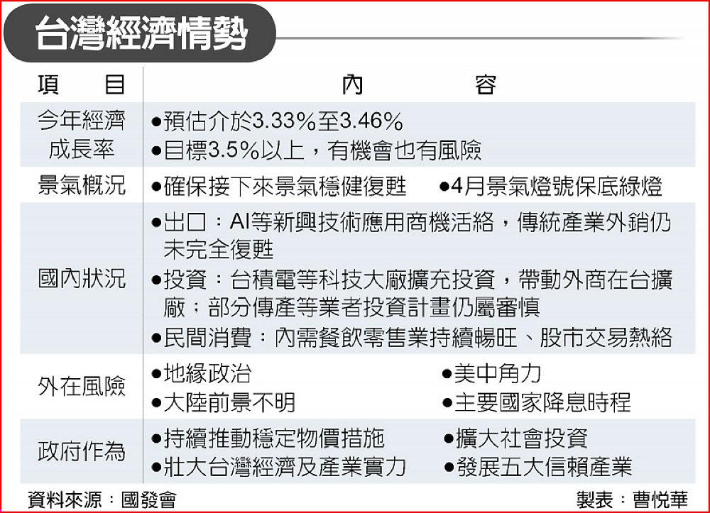 與會的國發會經濟處長吳明蕙說,今年經濟成長率預估介於3.33%至3.46%,優於去年的1.31%,今年會以以3.5%以上為目標,是否達成將受下半年國內外局勢影響,有機會,也有挑戰跟風險。