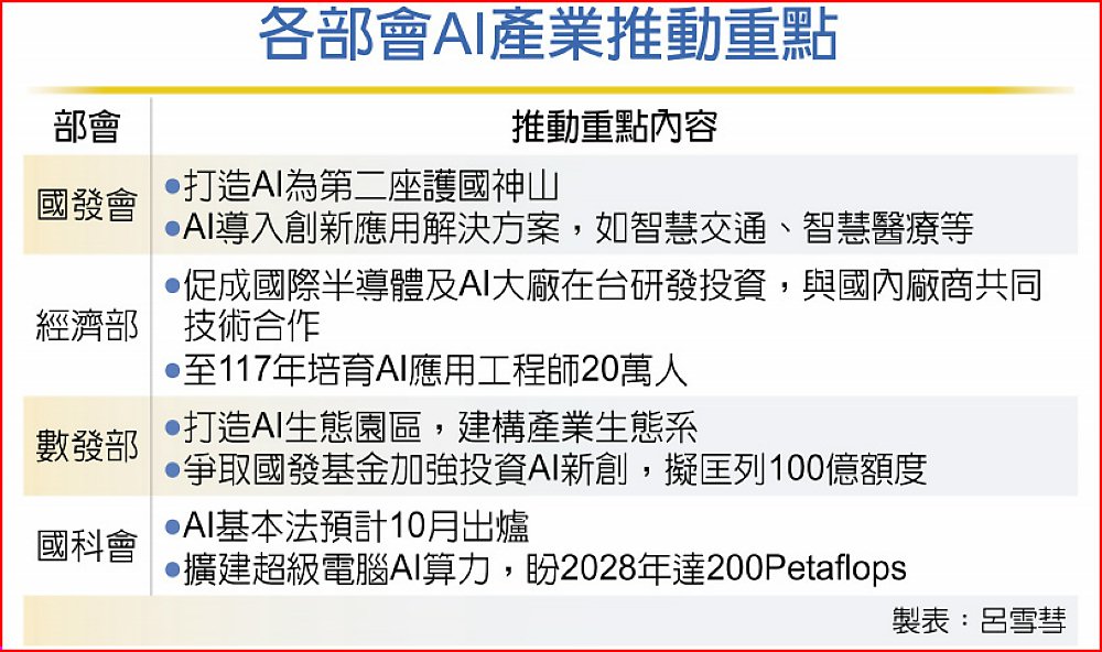 為打造台灣成為AI人工智慧島,各部會總動員!立法院12日將就深化AI生態系及充實AI人才,與產業AI化等相關議題,邀請國發會、經濟部、數發部等五部會首長赴立法院報告。數發部計畫打造虛擬AI生態園區,建構AI產業生態系,國發會已同意國發基金匡列百億額度給數發部,作為加強投資AI新創的銀彈工具,以促成生態系成形。