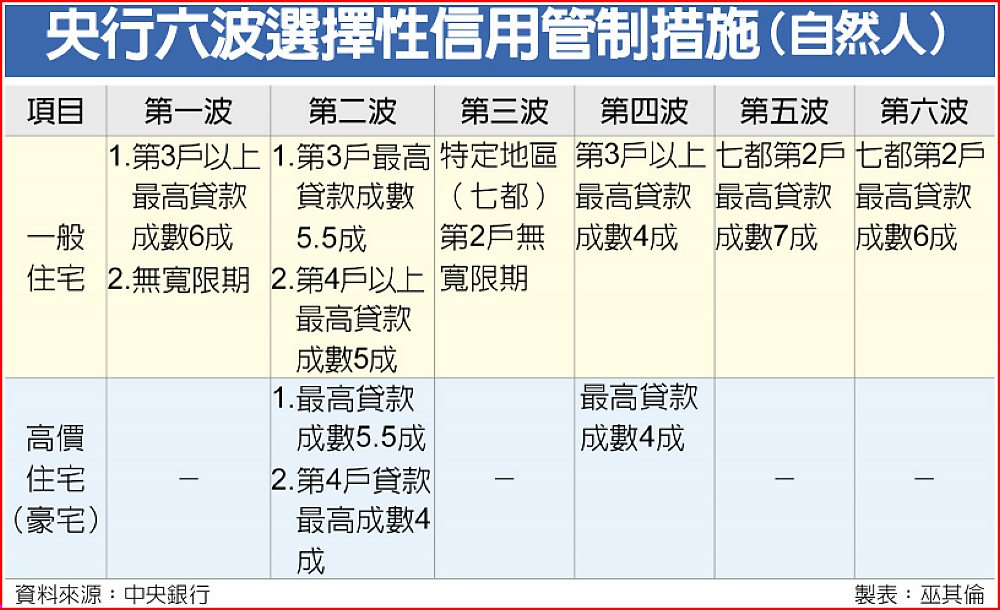 央行2020年12月以來共祭出五波選擇性信用管制,再推第六波,央行總裁楊金龍表示將持續緊盯房市,關注兩大指標,一是銀行不動產放款集中度,二是金融穩定,將滾動式調整措施。