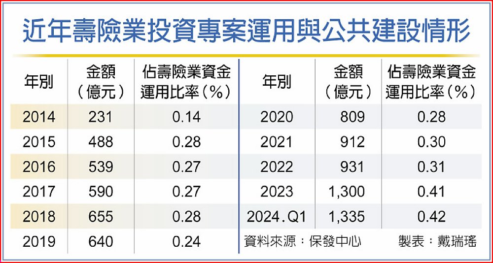 據保發中心統計,壽險業投資專案運用與公共建設,從2014年僅有231億元,2016年突破500億元,到2023年正式破千億元、來到1,300億元,至今年第一季底為1,335億元,顯示壽險業資金投資公建的金額,有逐年增加的趨勢。