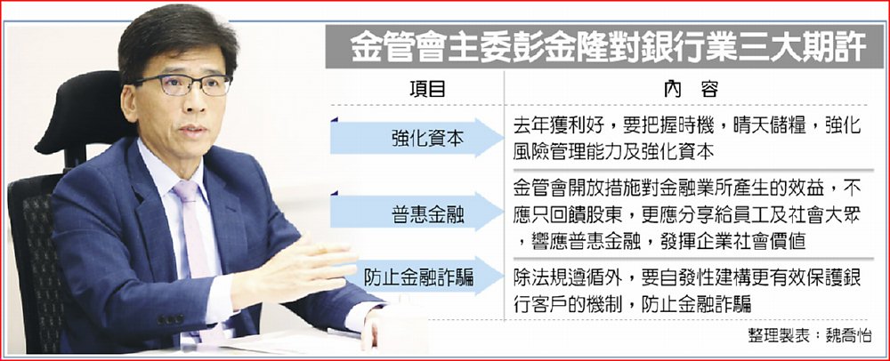 本國銀行最賺錢時刻,金管會主委彭金隆開三大要求。金管會25日舉行銀行總經理會議,是彭金隆上任後首次與所有國銀總經理面對面,他在會中提三大期待,一是現在為國銀獲利及經營體質「最好的時期」,應要晴天儲糧、強化資本;二是推動普惠金融,三是金融防詐。