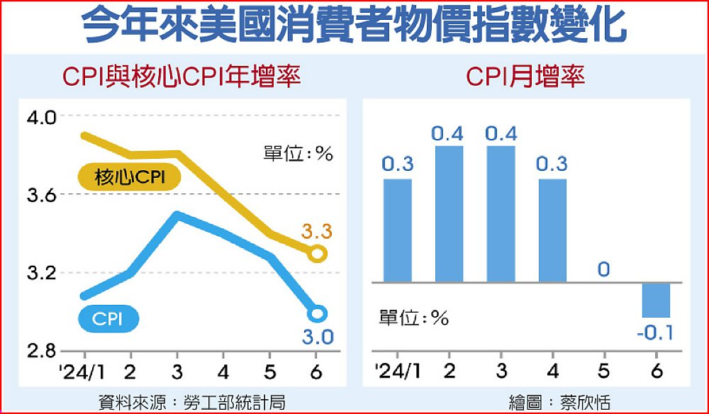 美國6月消費者物價指數(CPI)月增率意外轉負,為疫情爆發來首見,CPI和核心CPI年增幅均創3年來新低。美國通膨連續三個月降溫,讓聯準會(Fed)朝啟動寬鬆循環更進一步,9月降息機率大增。
