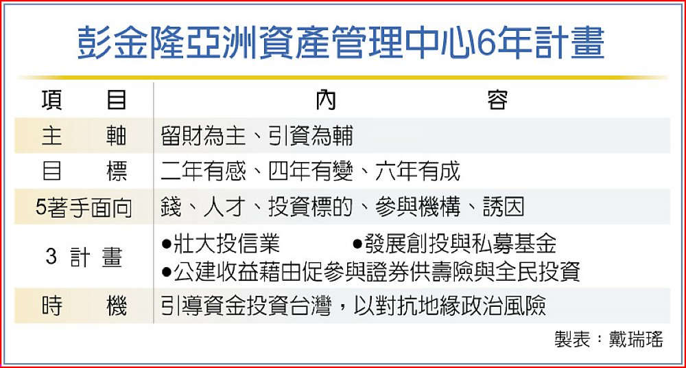 彭金隆透露,8月下旬將公布金管會主管範圍的亞洲資產管理中心規劃,從錢、人才、投資標的、參與機構及誘因等五方面著手,包括鬆綁規定壯大台灣投信產業;重啟創投及私募基金機制;發展家族辦公室與私人銀行;開放更多樣化金融商品與爭取投資誘因等,他強調,不是要複製新加坡或香港經驗,而是「在亞洲打造具台灣特色的資產管理中心」。