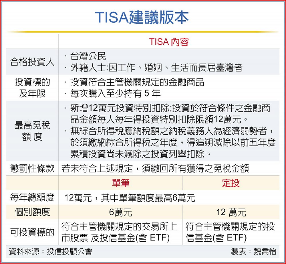 彭金隆透露,金管會打造亞洲資產管理中心的藍圖內,推動建立台灣個人投資儲蓄帳戶(TISA)制度亦列入其中,期盼讓投資人享有租稅優惠,提升民眾投資管理資產能力與意識。目前投信投顧公會爭取參考日本作法,希望投資可享新台幣2.4萬元列舉扣除額。