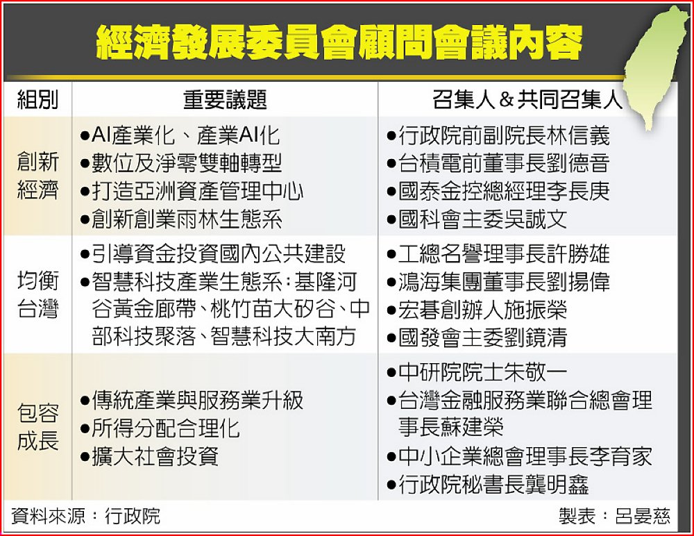 為落實卓內閣「創新經濟」、「均衡台灣」、「包容成長」三大施政目標,首場經濟發展委員會顧問會議將在9月3日登場,行政院長卓榮泰13日核定近60人顧問名單,邀請前行政院副院長林信義、工總名譽理事長許勝雄、中研院院士朱敬一擔任分組召集人,盼集思廣益,找出新方向。
