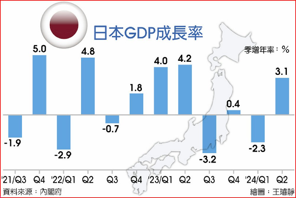日本內閣府15日公布最新數據,在民間消費成長的推動下,今年4到6月間國內生產毛額(GDP)與上季比較折算年率之經濟成長率為3.1%,高於市場預估的2.3%,有望成為進一步升息的支撐。