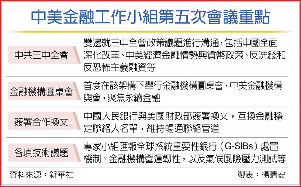 第五輪中美金融工作小組會議8月15日至16日在上海舉行,會議期間,中國人民銀行與美財政部簽署換文,達成中美金融穩定合作共識。美國總統選戰如火如荼之際,再加上中共三中全會於月前落幕,中美金融工作組持續發揮溝通作用,穩定雙邊金融關係。
