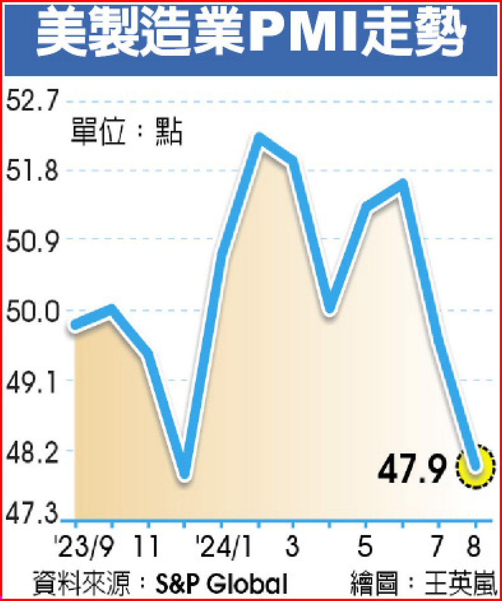 金融數據供應商標普全球3日公布,美國8月製造業採購經理人指數(PMI)終值由7月的49.6降至47.9,連續第二個月低於榮枯線50,並低於預期與初值,是今年以來最糟,另據美國供應管理協會(ISM)同日公布,8月製造業PMI從7月的46.8升至47.2,連續第五個月萎縮且低於預期47.5,均顯示製造業動能疲弱。