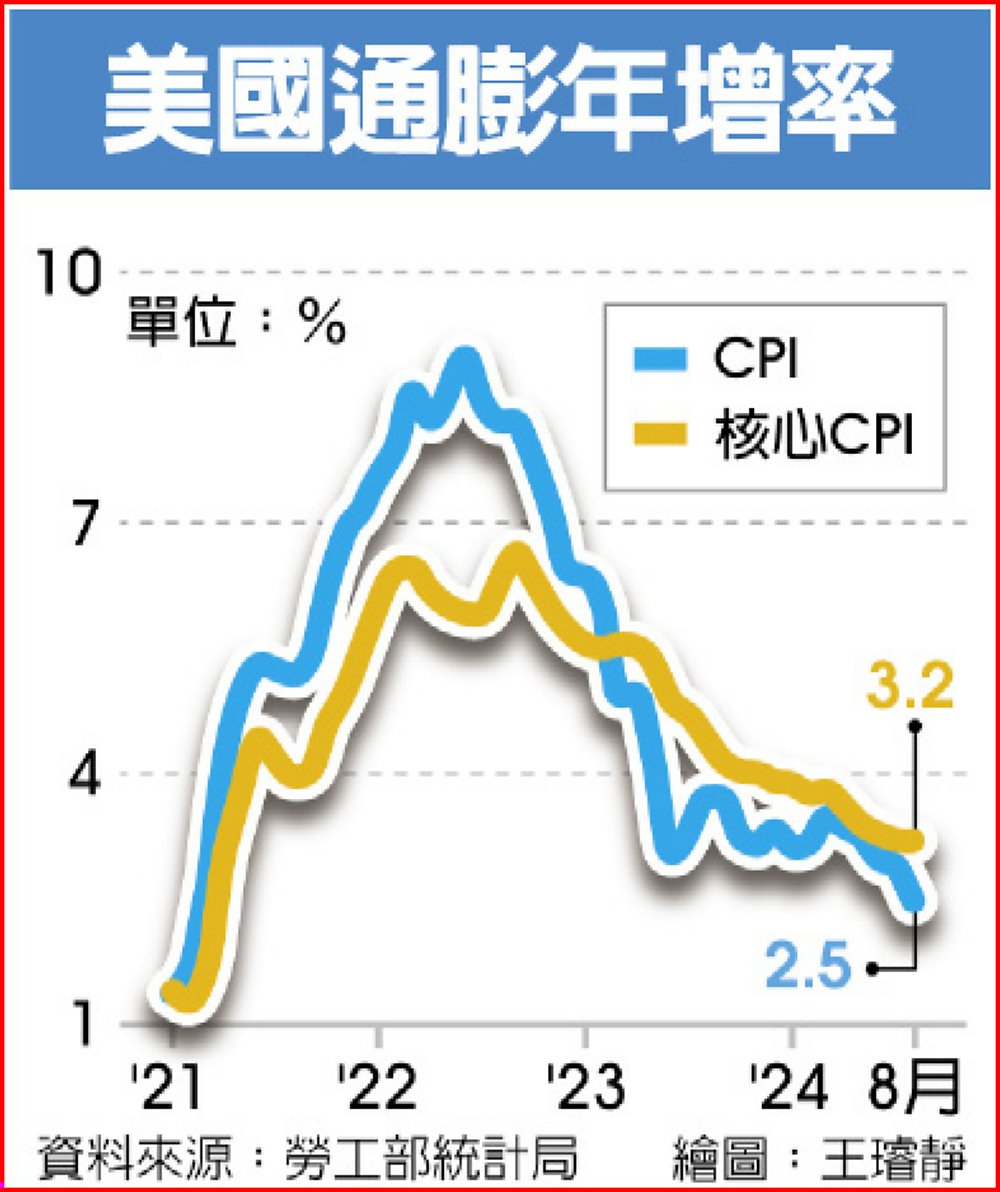 美國勞工部勞動統計局11日公布,8月消費者物價指數(CPI)月增0.2%,與7月持平,年增從7月2.9%放緩到2.5%,寫2021年2月來最小增幅。排除易波動食品與能源價格的核心CPI月增0.3%,較7月微升,年增持平在3.2%。