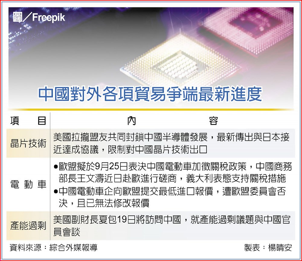 另一方面,美國也持續緊盯中國產能過剩議題,美國副財長夏包(Jay Shambaugh)19日將啟程訪中,舉行中美經濟工作組會議,美方特別聚焦中國產能過剩的問題。