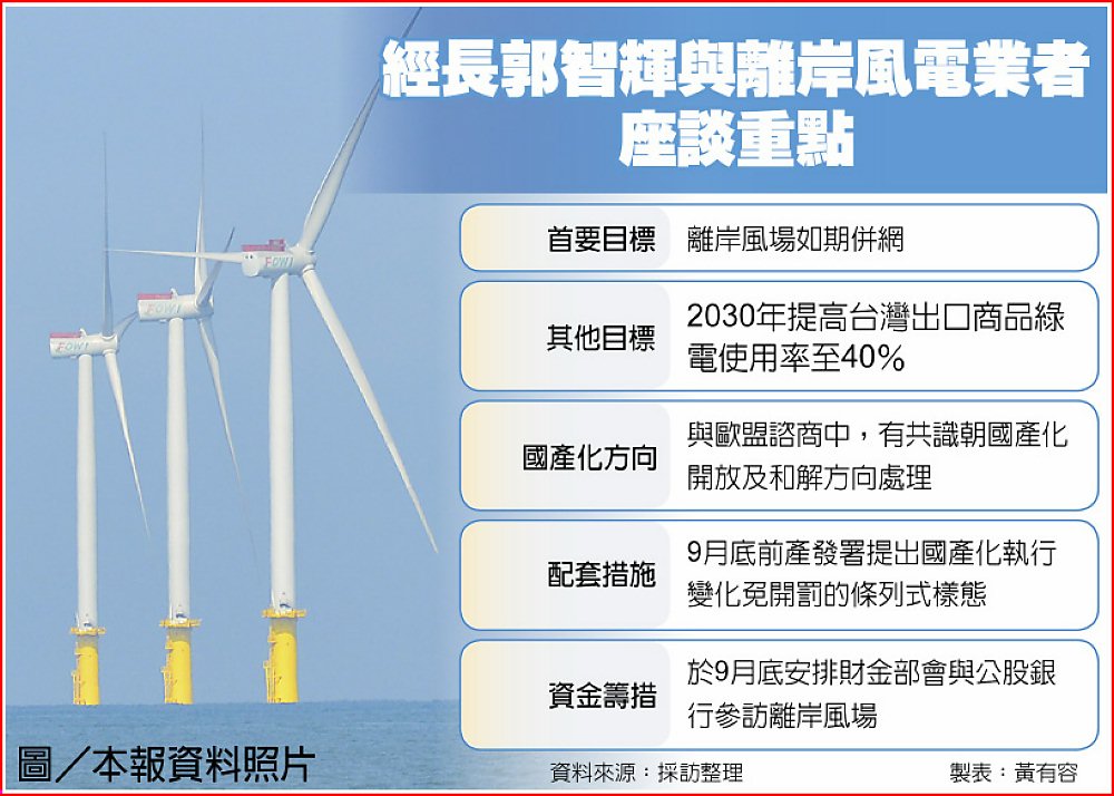 郭智輝急會風電開發商,強調正與歐盟在WTO架構下進行諮商,政府有責任告知3-1、3-2期得標業者未來國產化政策走向,期望開發商有競爭力。有關國產化一定會朝「開放」目標執行。