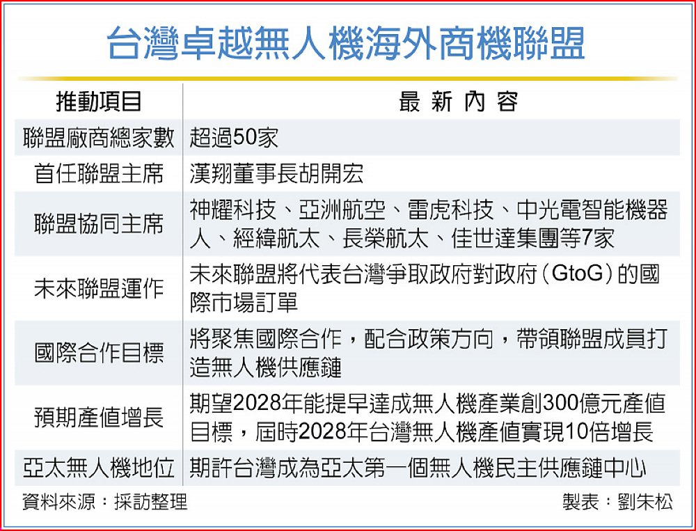 台灣無人機聯盟主導者漢翔表示,該公司長期執行軍用及民用飛機的研發專案,「系統整合」正是其所長,有信心能在無人機領域提供關鍵貢獻,協助所有廠商發揮自身實力,先建立出國內的經濟規模,打造「短鏈」與「韌性」,進而凝聚成堅實的國家隊。至於長榮航太,則已取得「陸用型監偵無人機原型機」標案量產機型,代表公司的研發生產能力已受到肯定。