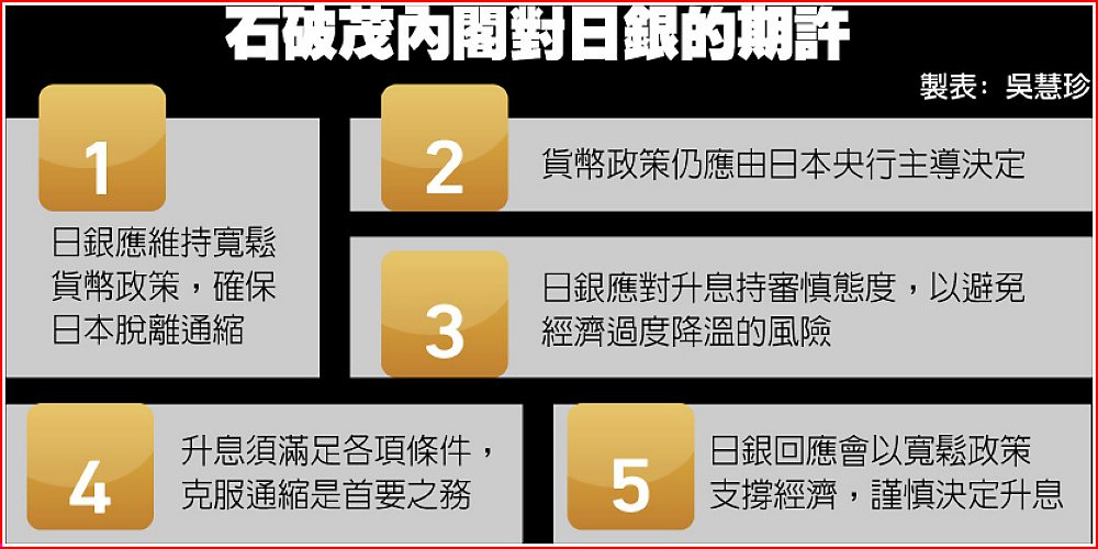 但石破茂8月接受路透採訪時曾表示,日銀終結負利率的政策路線很正確,他支持貨幣政策進一步正常化,可提升產業競爭力。