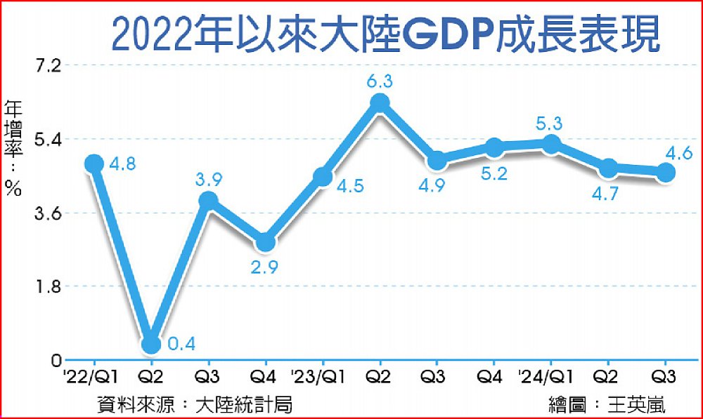 大陸統計局18日公布第三季GDP年增4.6%,雖略優於市場預期,但增速較第二季放緩0.1個百分點,且前三季年增4.8%,達成全年增長5%左右的官方目標難度加大。數據公布不久,中國人民銀行、金融監管總局及證監會隨即推出一系列措施,包括預告降準、降息,及多項刺激股市政策正式實施,展現救市決心。