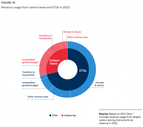 大多數國家使用碳定價收入(碳稅/費、ETS)來資助與氣候相關的計畫或支持一般預算。報告指出,碳收入有許多潛在的用途,可滿足各種政策目標,然而就像所有財政工具一樣,碳稅和碳排放交易系統的收入決策,牽涉到經濟、社會和環境目標之間的競爭優先順序,常常具有挑戰性。單一政府內的不同部門往往持有不同觀點,例如捷克的環境與工業部門支持指定用途,而財政和交通部門則主張將收入用於支持國家一般預算並整合其債務。