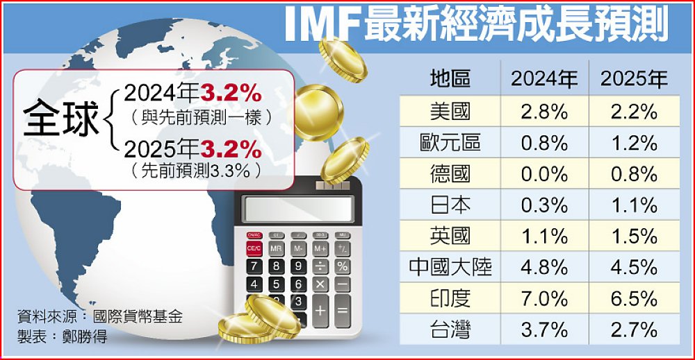 至於中國大陸,今年經濟成長預測被下調0.2個百分點至4.8%,因淨出口的提振效應僅部分抵銷了房市持續疲軟和消費者信心低迷的影響,明年經濟增長的預測依然是4.5%,但IMF並未把中國大陸最近宣布的刺激措施考慮在內。IMF也說,台灣今年經濟成長率預估為3.7%,較今年4月預測大幅上修0.6個百分點;明年成長率則估為2.7%。