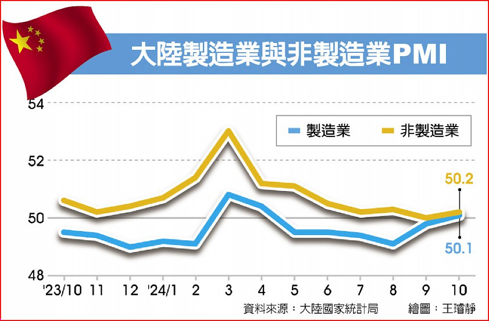 大陸製造業景氣在10月立刻出現回溫跡象。大陸統計局10月31日最新公布,10月份製造業採購經理人指數(PMI)較上月回升0.3點至50.1,不僅高於預期,也是今年5月來首次回到榮枯線以上,指數創半年新高。10月非製造業PMI亦較上月回升0.2點至50.2,反映官方一攬子刺激政策漸有成效。