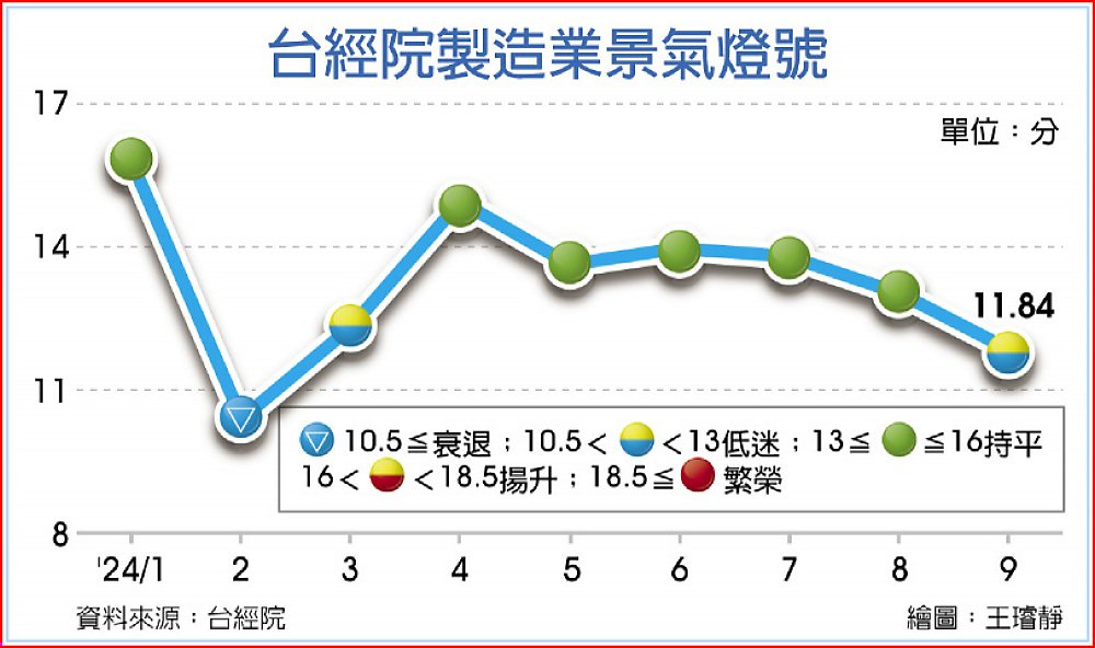 台灣經濟研究院10月31日發布9月份台經院製造業景氣燈號,製造業景氣信號值連跌三個月,9月的11.84分為今年的次低,燈號則從代表景氣持平的綠燈轉為代表景氣低迷的黃藍燈,終結4月以來的連五顆綠燈。